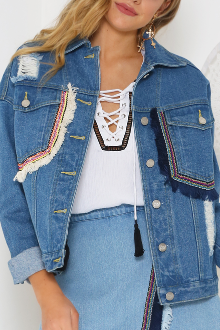 Wholesale Blue Ripped Denim Jacket for Women | 100% Organic Cotton Eco-Friendly Streetwear (OEM/ODM Supported)
